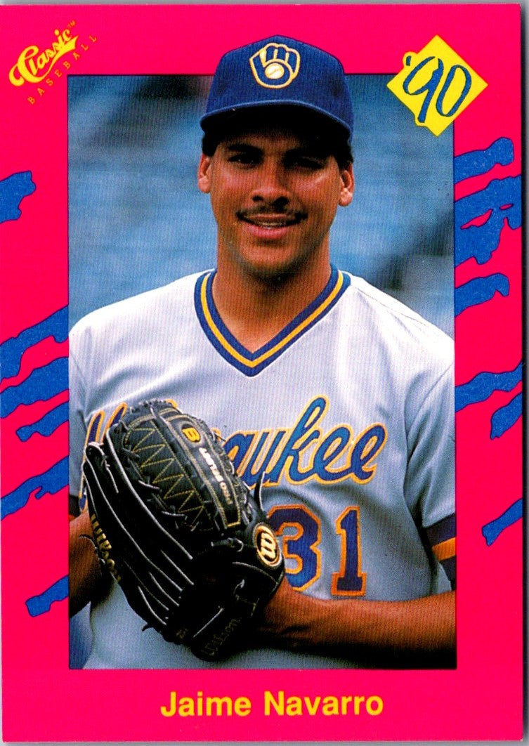 This 1990 Classic update Jaime Navarro card from the Milwaukee Brewers is a great addition to any fan's collection. Featuring his iconic navy blue and gold Brewers uniform, this card captures the legendary pitcher in action. This card also features exciting stats, including his career strikeouts and wins, for a closer look at his impressive performance. Add this card to your collection and celebrate Jaime Navarro's career today!