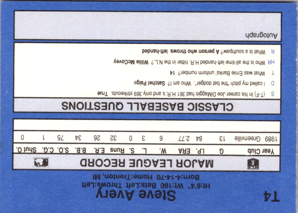 This 1990 Classic Update Steve Avery #T4 Atlanta Braves card is perfect for any Braves fan. Featuring Avery in a classic 1990's Braves uniform, this card captures the spirit of the team. With great detail and vibrant colors, this card will make a great addition to any collection. Show your support for the Braves with this timeless card.