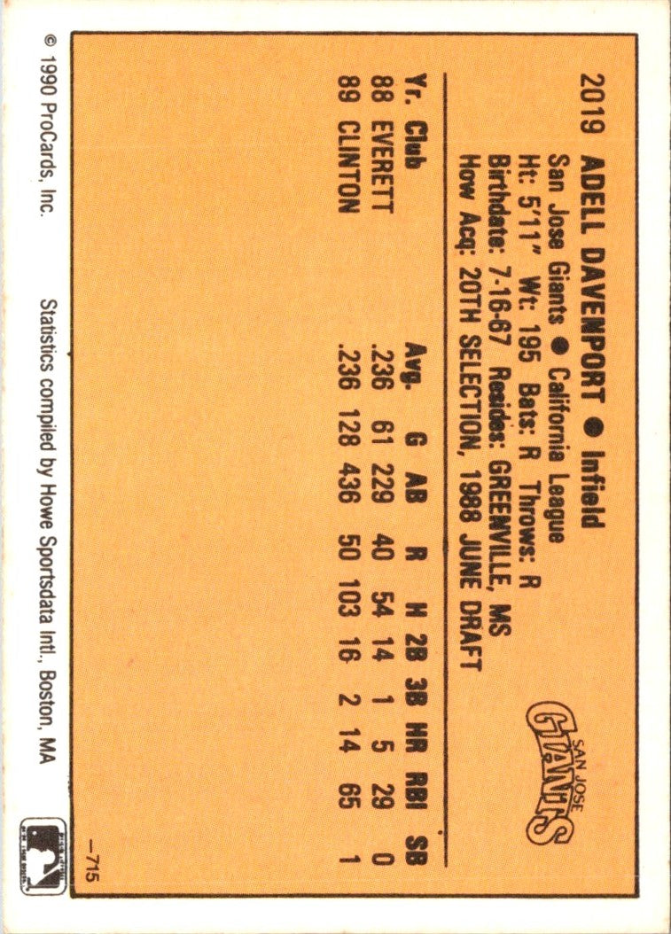 This 1990 CMC Adell Davenport #715 San Jose Giants card is a must-have for any collector of Giants memorabilia. The card features a full-color, full-body image of Davenport in his Giants uniform, with his name and number printed in bold font below. The card has a glossy finish that adds an extra touch of quality. With its vibrant colors and classic design, this card is perfect for any collector looking to add a timeless piece to their collection. Add this card to your collection today and show your support for the Giants!