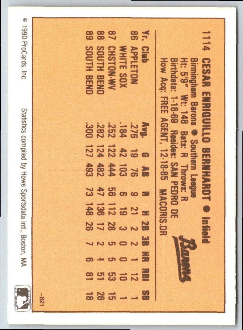 This 1990 CMC Cesar Bernhardt #821 Birmingham Barons card is an essential piece for any baseball card collection. Featuring a vibrant color photo of Cesar Bernhardt in action, this card showcases the power and skill of one of the game's best players. With its eye-catching design and sharp corners, this is a must-have for any fan of the Birmingham Barons. Whether you choose to display it or keep it in a protective sleeve, this card is sure to become a centerpiece of your collection. Add this card to your collection today and show your support for the Birmingham Barons!