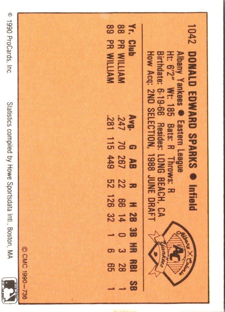This 1990 CMC Don Sparks #736 Albany-Colonie Yankees card is a must-have for any serious collector. This card is in great condition and features a full-color image of Sparks playing for the Yankees, with his name and team logo in gold lettering on the front. This card is perfect for any fan of the Yankees, or for any collector looking for a timeless piece to add to their collection. Don Sparks was an important part of the Yankees during the 1990 season, and this card is a great way to represent that. Don't miss out on the chance to get your hands on this classic card!