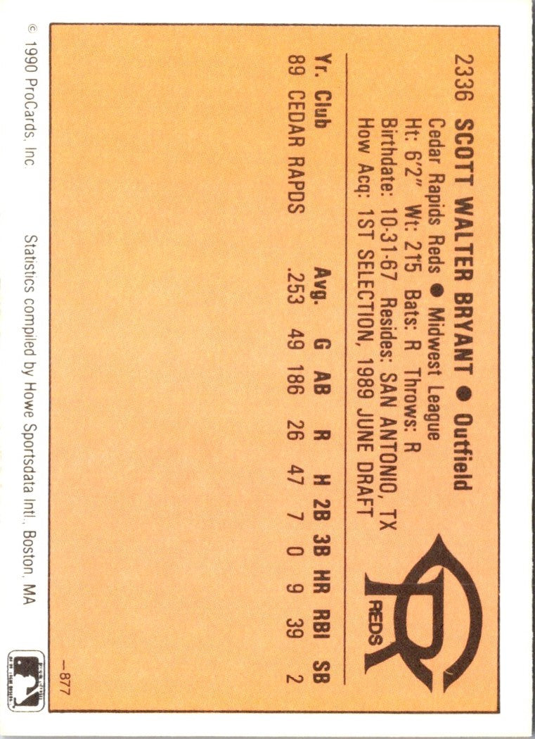 This 1990 CMC Scott Bryant #877 Cedar Rapids Reds card is a must-have for any baseball fan's collection. Featuring a stunning image of Scott in action, this card is perfect for any fan of the Cedar Rapids Reds. The card is in mint condition and will make a great addition to any fan's collection. It is sure to be a conversation starter and will bring a smile to any fan's face. So don't delay, add this card to your collection today!
