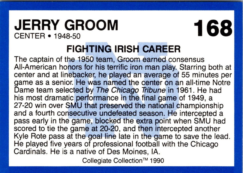 Description: 1990 Collegiate Collection Notre Dame Jerry Groom #168