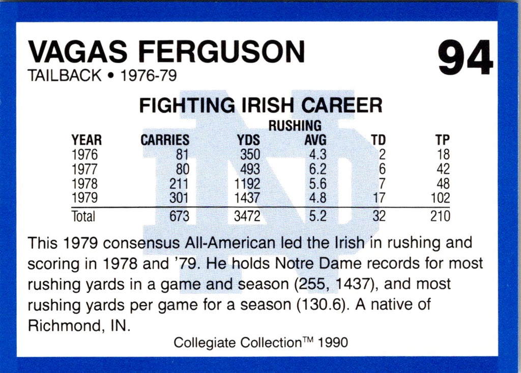 Description: 1990 Collegiate Collection Notre Dame Vagas Ferguson #94