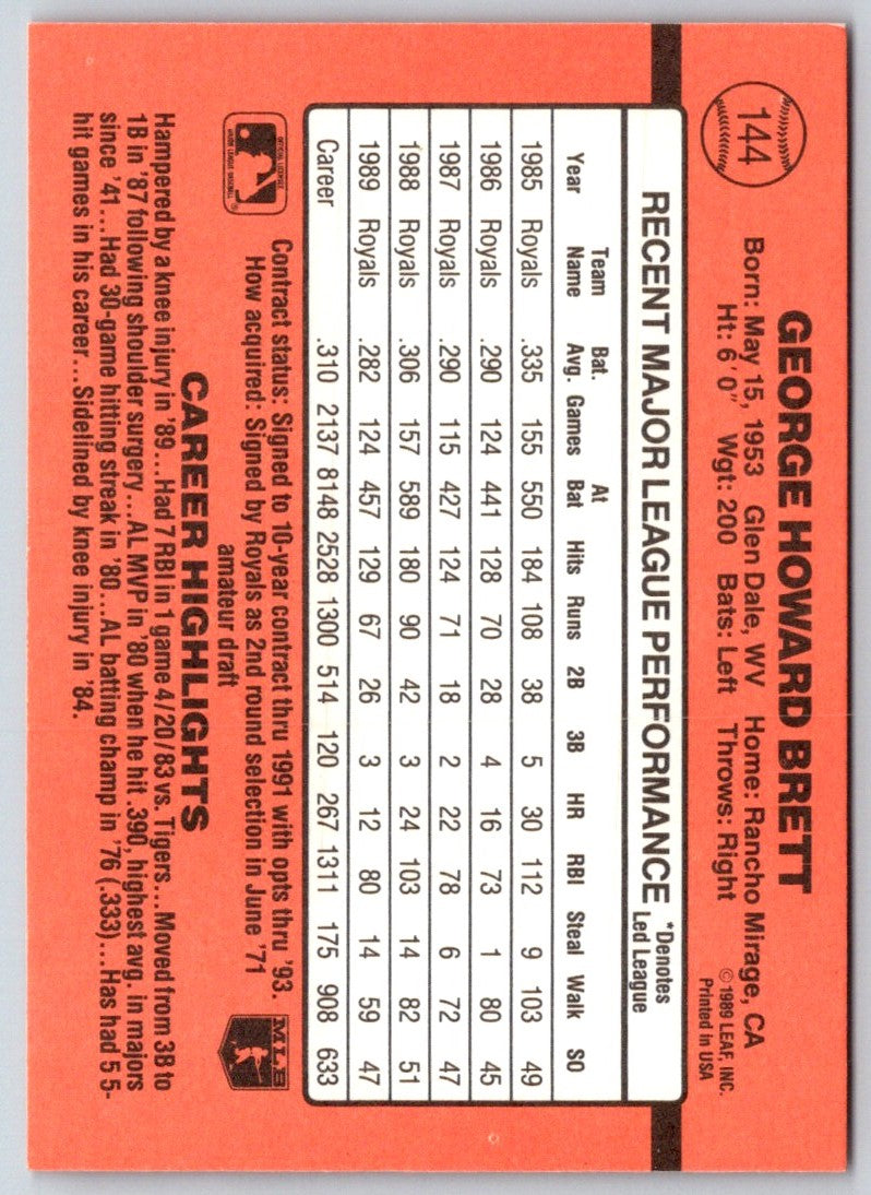 This 1990 Donruss George Brett #144 Kansas City Royals card is the perfect addition to any baseball card collection! This card features a classic image of George Brett standing in the batter's box with a classic Donruss design. The card is in Near Mint condition and features quality print on glossy card stock. Add this card to your collection and own a piece of MLB history.
