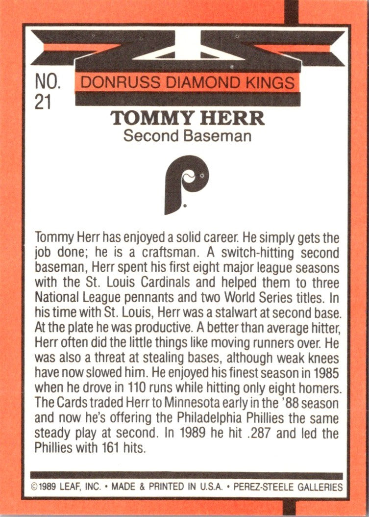 Description: 1990 Donruss Super Diamond Kings Tommy Herr #21