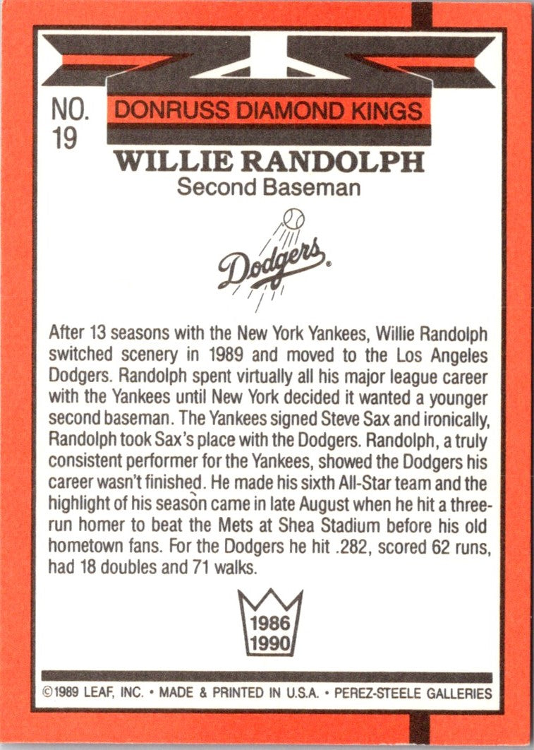 Description: 1990 Donruss Super Diamond Kings Willie Randolph #19