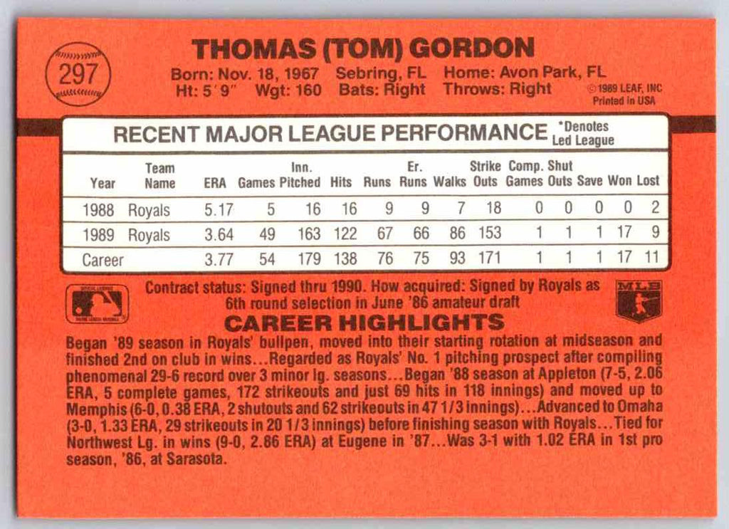 This 1990 Donruss Tom Gordon #297 card is an essential part of any baseball card collection. Featuring Gordon in a Kansas City Royals uniform, this card captures the moment, and is a great item to add to your sports memorabilia. With a crisp design and detailed imagery, this card is a must-have for any die-hard Royals fan. Add to your collection today and get a piece of baseball history!