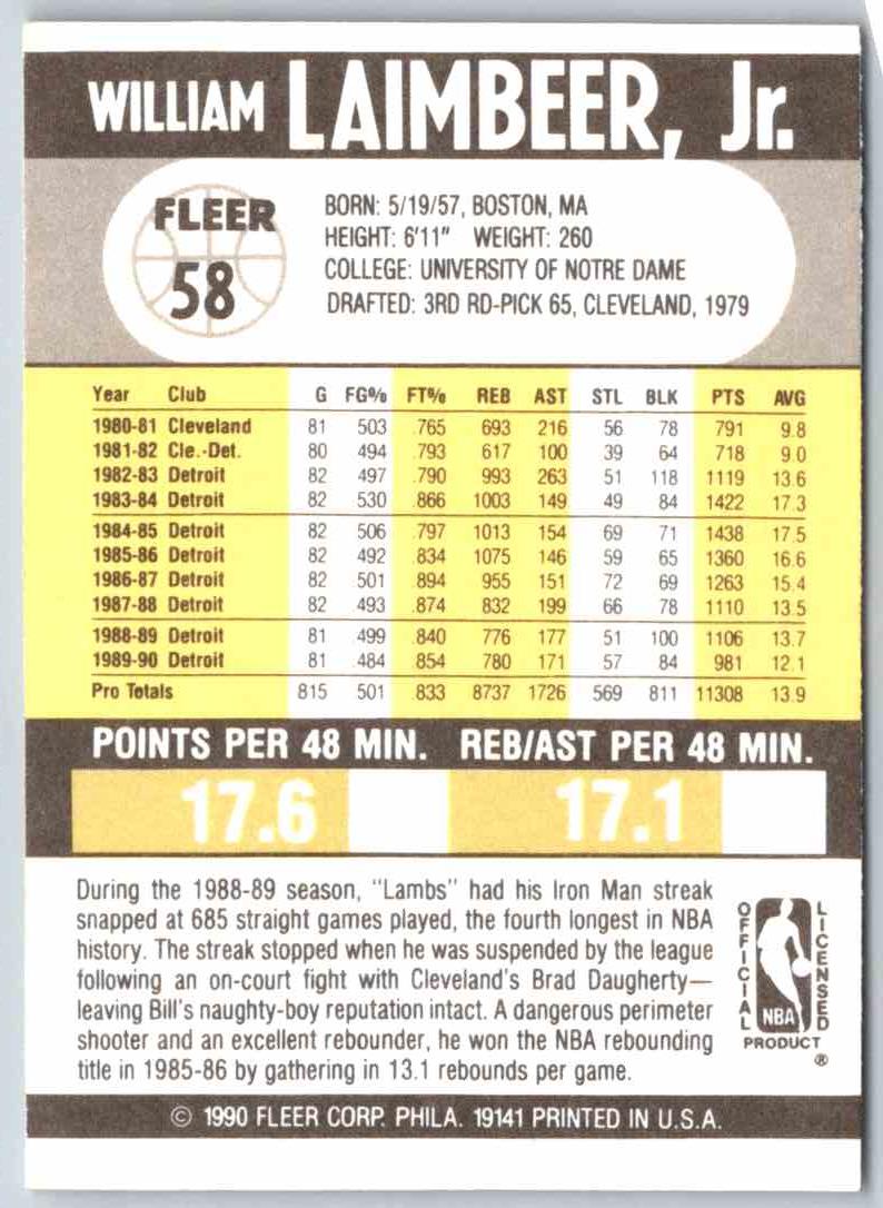 This 1990 Fleer Bill Laimbeer #58 trading card is a must-have for basketball fans and card collectors alike. As a member of the Detroit Pistons, Laimbeer was a four-time NBA All-Star and two-time NBA champion. He was known for his physical style of play and his ability to put up numbers. This card features a classic black and white headshot of Laimbeer in his Pistons jersey, along with a full list of his career stats. Add this timeless piece of basketball memorabilia to your collection today!