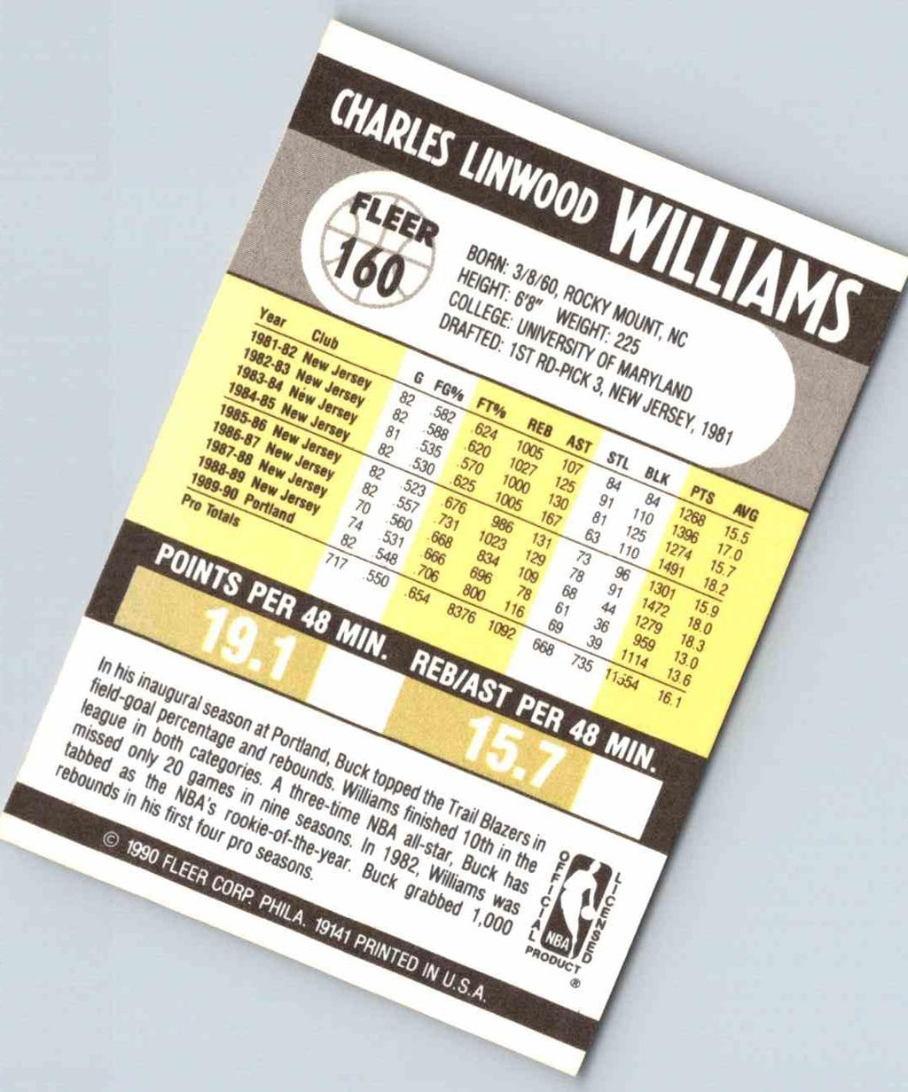 This 1990 Fleer Buck Williams #160 trading card showcases a stunning image of the Hall of Fame power forward. His signature is printed on the front of the card along with a brief bio on the back. It is a must-have item for any basketball fan or collector. Add this card to your collection today and add value to your collection!