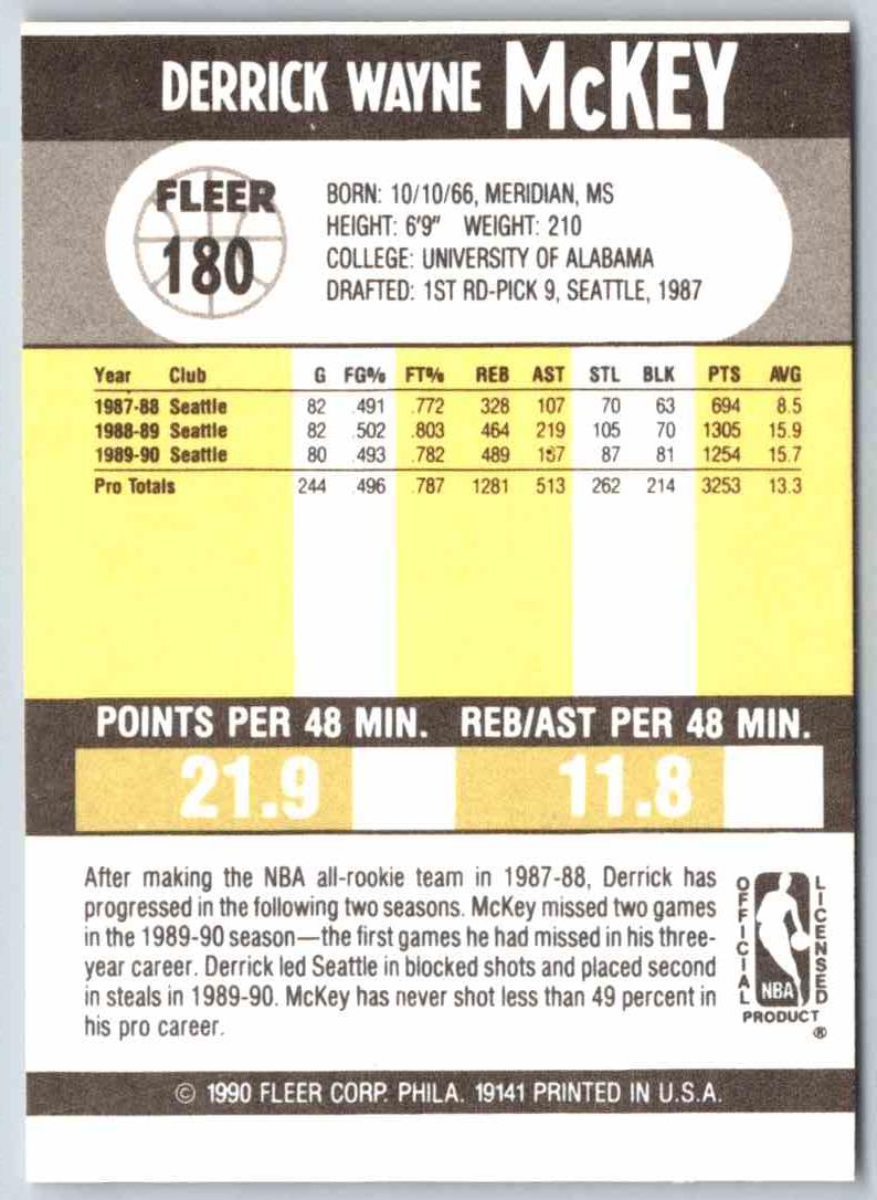 This 1990 Fleer Derrick McKey #180 is a must-have for any serious basketball collector! The card features a striking photo of the former Indiana Pacers player, complete with his signature facial expression and signature hairstyle. It also includes detailed stats and information about his career, making it the perfect way to honor this NBA great. Add this card to your collection and commemorate a piece of basketball history!