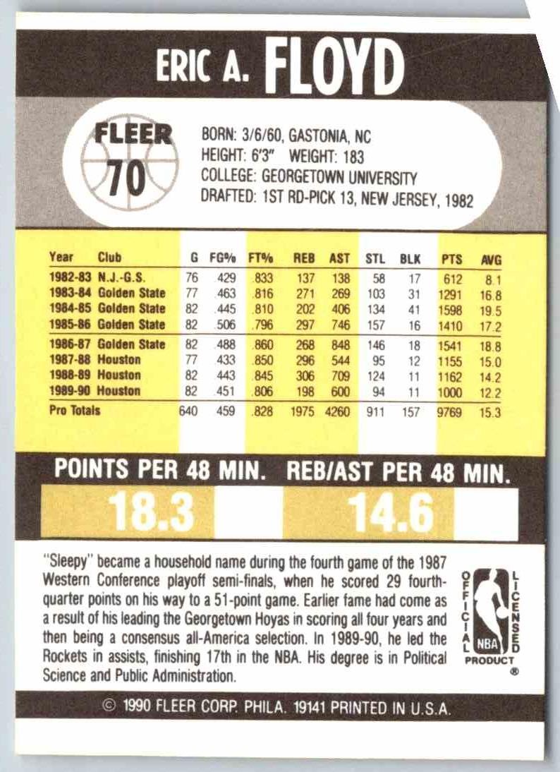 This 1990 Fleer Eric Floyd #70 card is an essential addition to any collector's collection. Boasting a stunning design, this card features Floyd in his iconic Houston Rockets uniform. With the vibrant colors and detailed illustration, you can truly appreciate the craftsmanship that went into its design. This card also features Floyd's vital stats, including his height, weight, and position. Make sure to add this incredible card to your collection today!