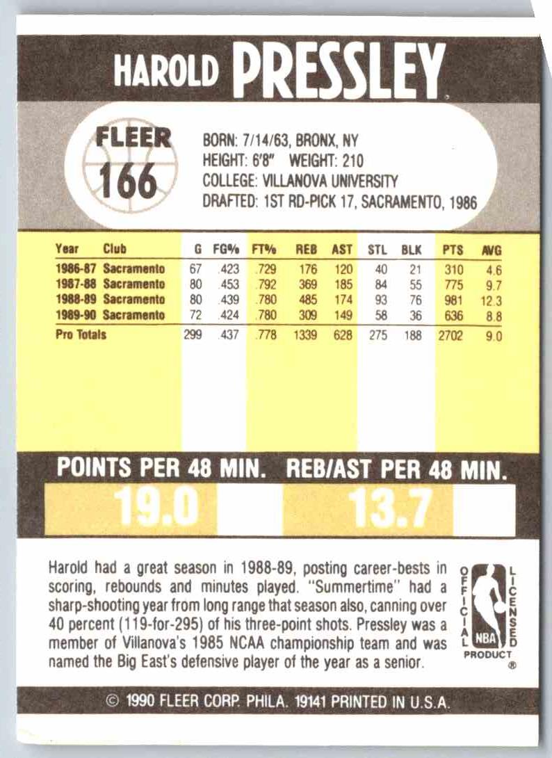 The 1990 Fleer Harold Pressley #166 is a must-have for fans of the game. Featuring the Philadelphia 76ers' standout forward, this card is sure to be coveted by collectors for its striking design and bright colors. It's a great way to commemorate one of the league's most memorable players and the amazing season he had in 1989-90. With this card, you can show your admiration for the star athlete and add a classic piece to your collection.