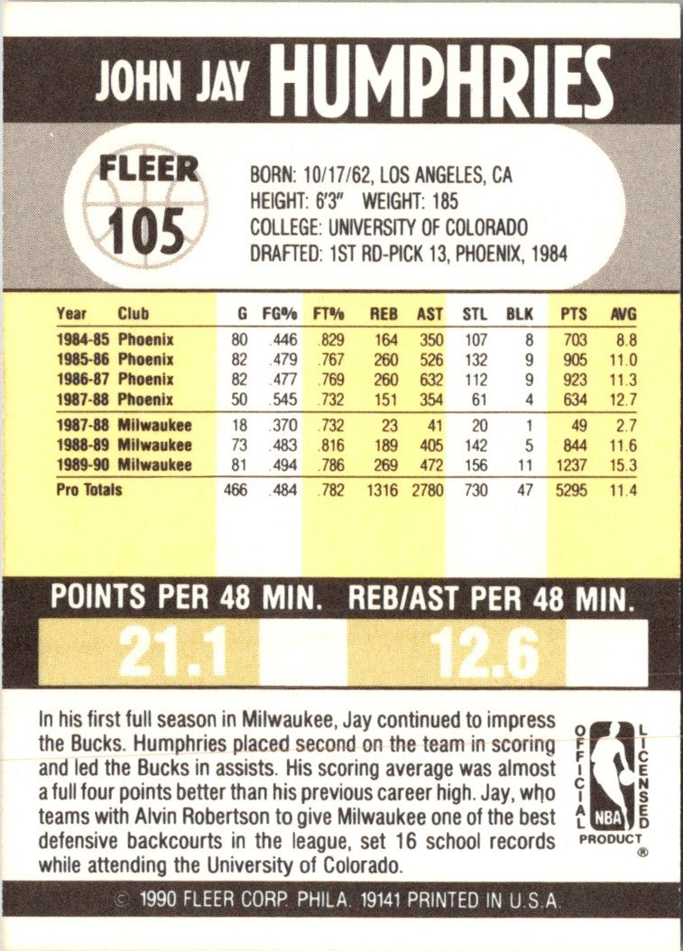 Description: 1990 Fleer Jay Humphries #105