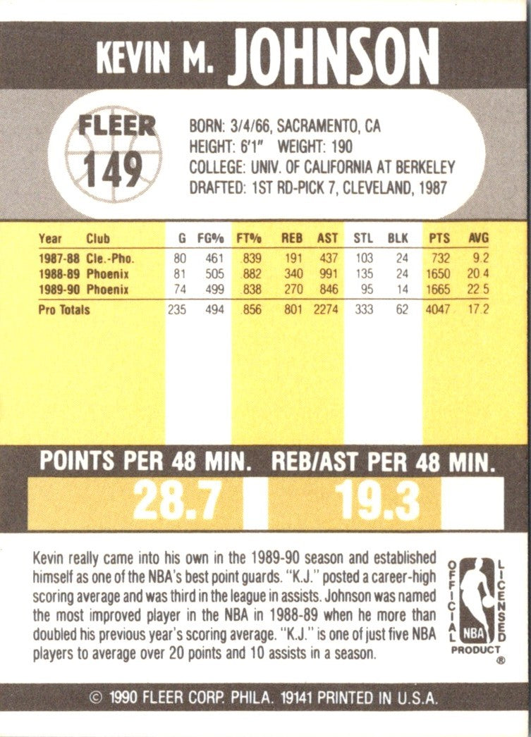 Show your Phoenix Suns pride with a 1990 Fleer Kevin Johnson #149 basketball card! This card features Johnson in his iconic Phoenix Suns jersey, with a bright purple background that pops. Johnson was a 3-time NBA All-Star and one of the most electrifying point guards of his era. Add this card to your collection today and celebrate one of the greatest Suns players of all time!