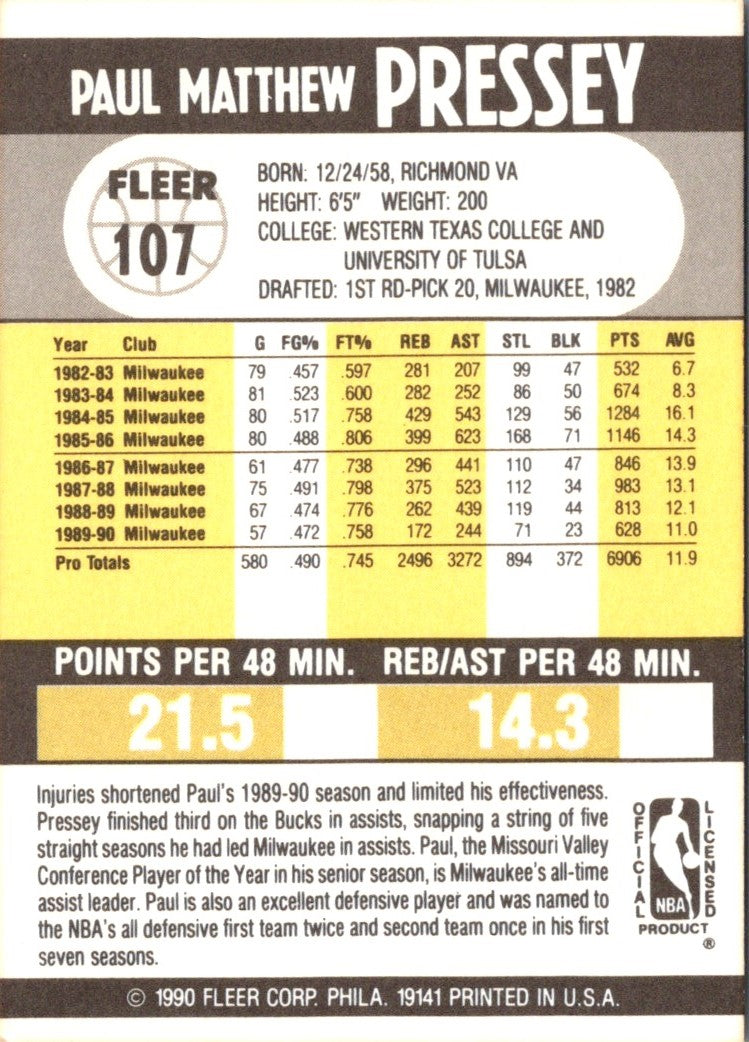 Description: 1990 Fleer Paul Pressey #107