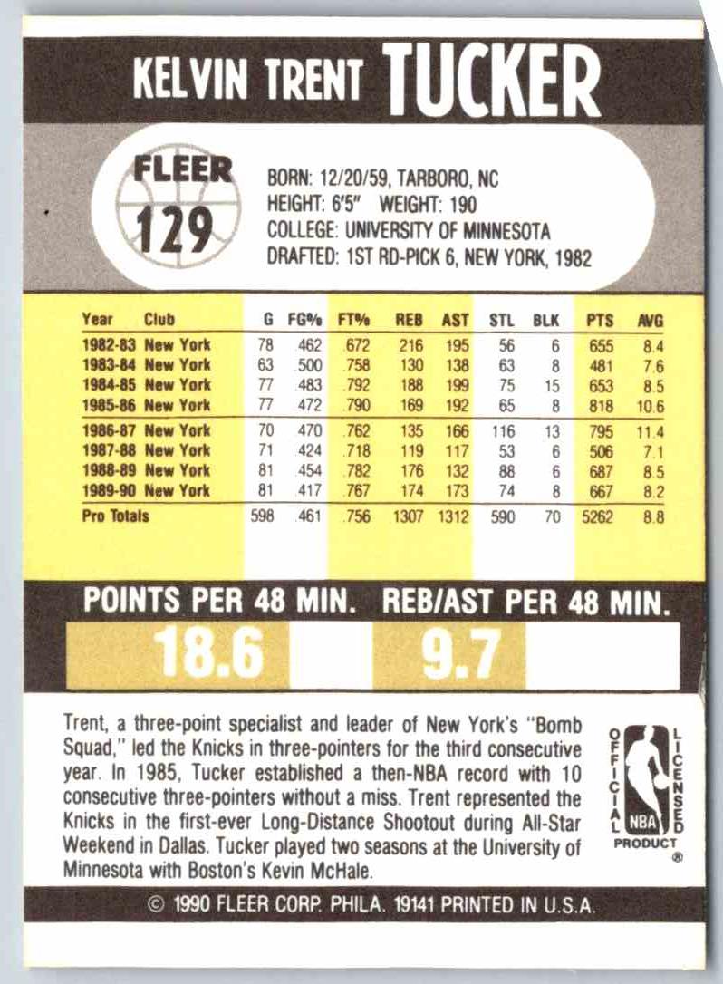 This 1990 Fleer Trent Tucker #129 trading card is a must-have for any basketball fan! Featuring an action shot of the former New York Knicks shooting guard, this card is sure to add great value to your collection. The card features a glossy finish, vibrant colors, and a detailed bio on the back of the card. An excellent choice for any fan of the New York Knicks, this card is sure to bring back great memories of Trent Tucker's time with the team. Add this card to your collection today!