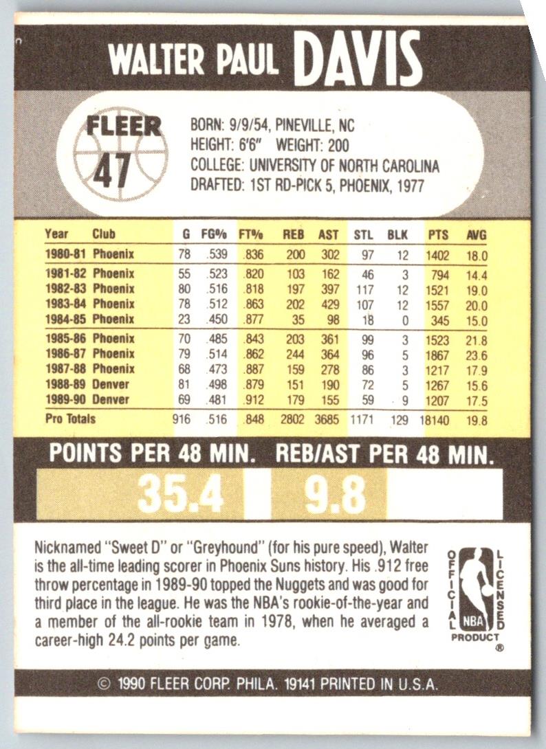 Walter Davis was an NBA star for 15 seasons, and the 1990 Fleer card #47 featuring him is a must-have for any basketball fan. This collectible card captures Davis in a classic pose wearing the Denver Nuggets' uniform. His stats and bio are printed on the back of the card, allowing you to relive some of the greatest moments in his career. Add this timeless piece of basketball history to your collection today!