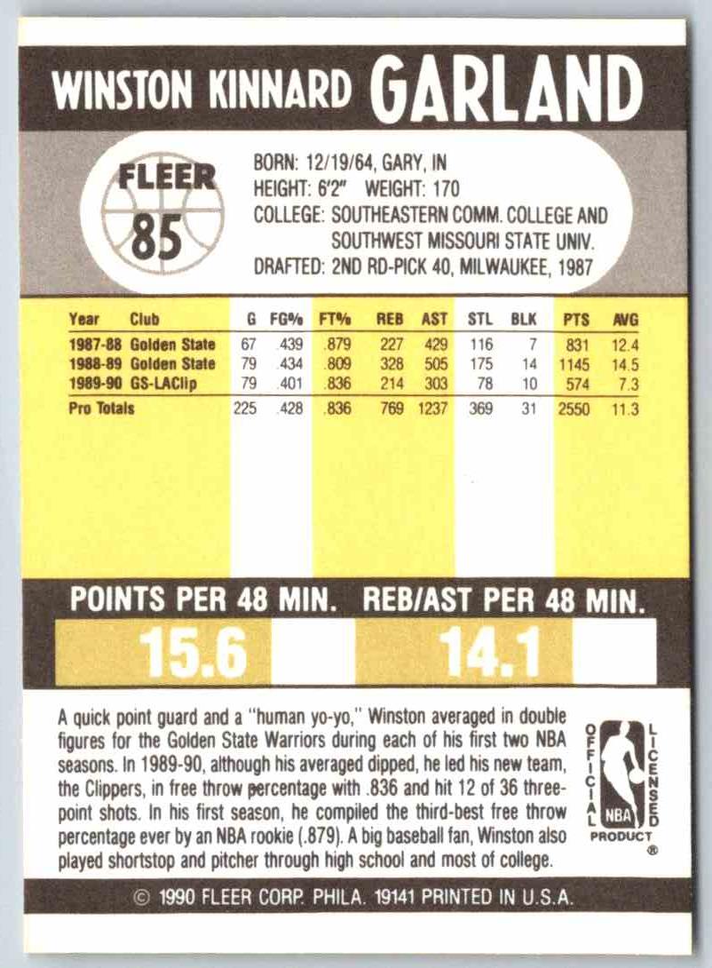 This 1990 Fleer Winston Garland card #85 is a must-have for any sports card collector! Featuring a stunning image of Winston Garland in full game uniform, this card is a beautiful piece of sports memorabilia. It features Garland's professional stats on the back, giving you a glimpse into what made him such an extraordinary athlete. With its high-quality construction and vivid colors, this card is a great addition to any collection and a must-have for any Garland fan!