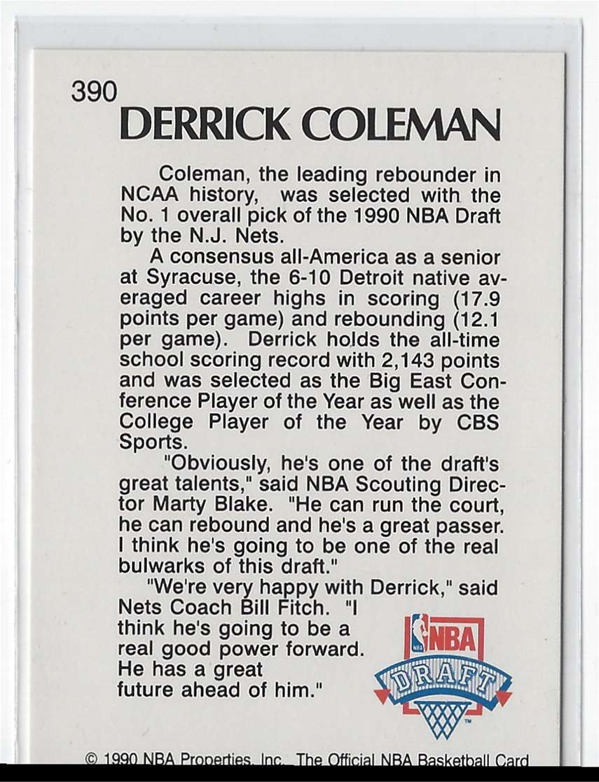 The 1990 Hoops Derrick Coleman #390 New Jersey Nets card is a must-have for any basketball fan. This card captures the dynamic power forward in action, with a glossy finish that makes the image come to life. Coleman was an All-Star in 1992 and was named to the All-Rookie Team in 1991, and this card commemorates his early success. The back of the card features career highlights, as well as a brief biography, making it a great addition to any basketball collection. Get your hands on this unique collectible and celebrate the NBA's most memorable moments.