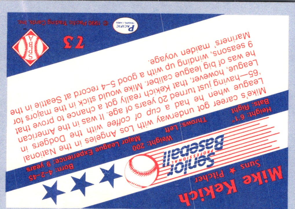 This 1990 Pacific Senior League Mike Kekich #73 Gold Coast Suns card is a must-have for any serious collector. Featuring amazing artwork and detail, this card is sure to stand out in any collection. The Gold Coast Suns team logo and colors are proudly displayed on the front, making it a great way to show your team pride. The back of the card reveals Mike Kekich's stats and a brief bio of his career. Add this gem to your collection today and show your support for the Gold Coast Suns!