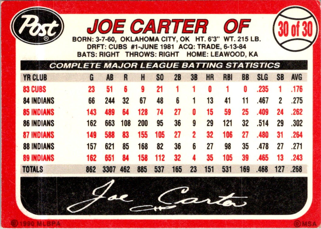 1990 Post Cereal Joe Carter #30