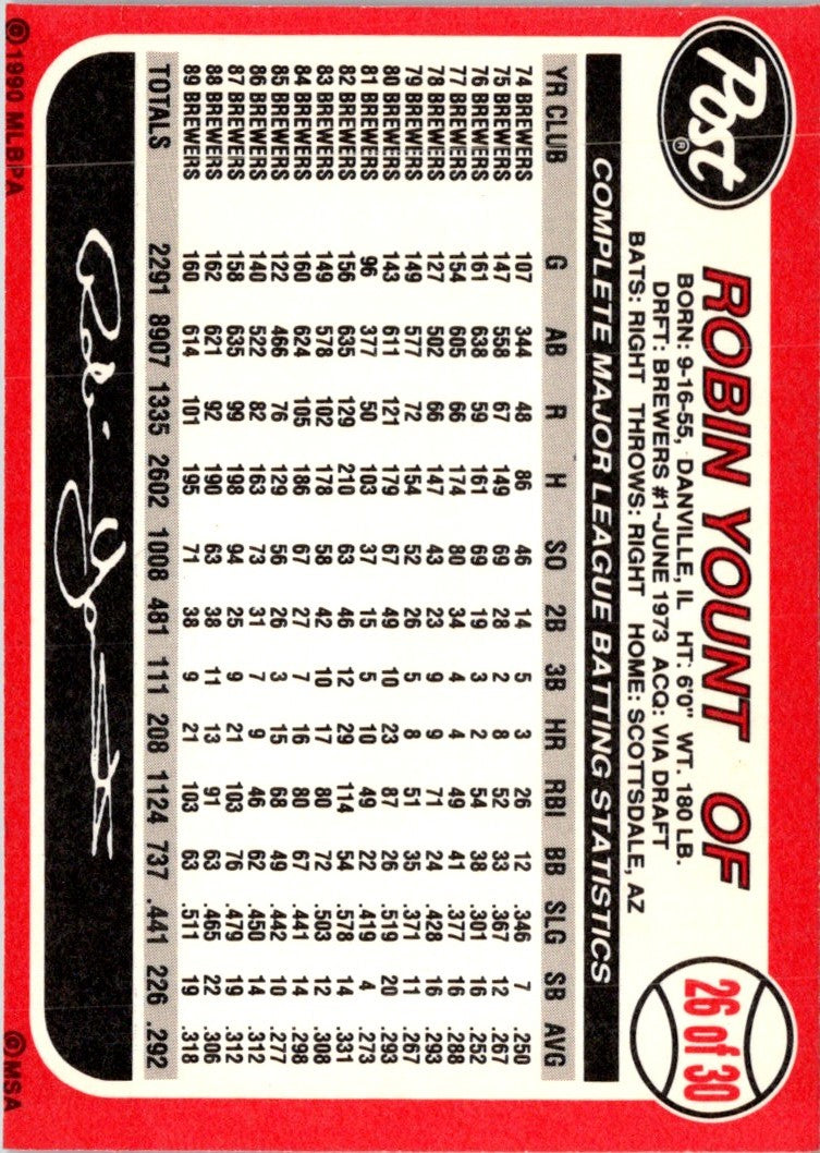 This 1990 Post Cereal Robin Yount #26 Milwaukee Brewers is a must-have for any sports fan or collector. It features a full-color image of Robin Yount in his classic Brewers uniform. The card itself is printed on a thick, glossy cardstock with a special 3D effect. The card is in mint condition, with no signs of wear or tear. The back of the card features a detailed biography of Yount and highlights his success with the Brewers. This card is a great way to show your support for the legendary Milwaukee Brewers and the great Robin Yount.