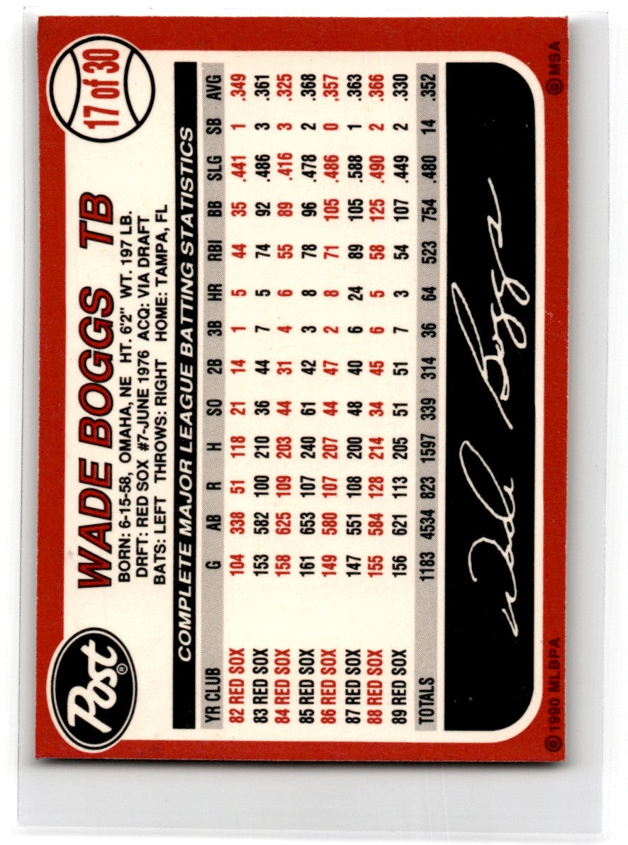 This 1990 Post Cereal Wade Boggs #17 Boston Red Sox collector's item is the perfect way to show your support for the legendary third baseman. Featuring an iconic image of Wade on the front of the box and a brief biography on the back, this cereal is sure to be a hit with any fan. Enjoy the delicious taste of Post Cereal while celebrating a baseball great. With this cereal, you'll be able to bring a little piece of baseball history into your home.