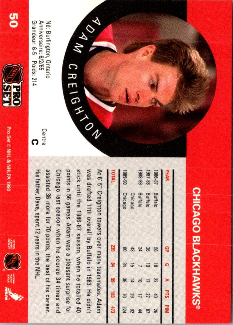 This 1990 Pro Set Adam Creighton #50Chicago Blackhawks card is the perfect addition to any hockey fan's collection. Featuring a beautiful full-colour image of the player on the front, and a biography of his career on the back, this card is a must-have for die-hard Blackhawks fans. This card also features Creighton's player stats, making it a collectible delight. Don't miss out on adding this unique piece of hockey history to your collection!