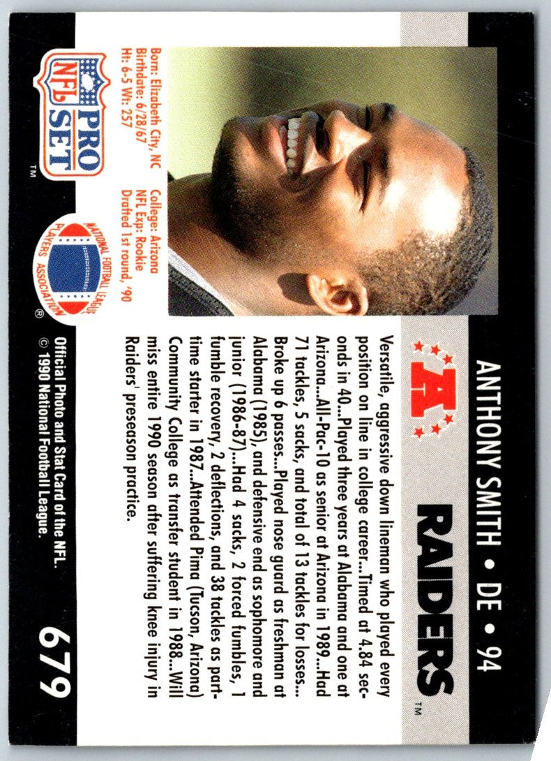 Introduce your collection to the powerful presence of Anthony Smith with this 1990 Pro Set #679 card. It features a full-color, action shot of Smith on the field, ready to make an impact. His Los Angeles Raiders uniform is in pristine condition and ready to show off its colors. Fans of the Raiders and Smith will love adding this card to their collections, as it captures the intensity and strength of the game. Grab your piece of football history today!