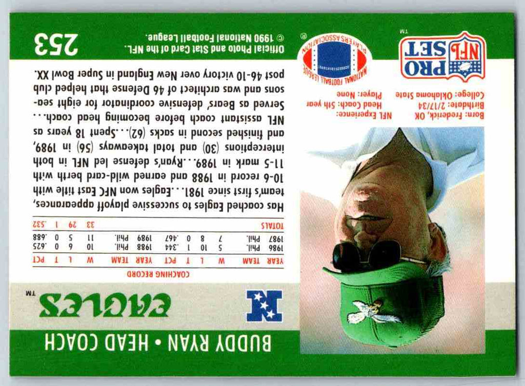 This 1990 Pro Set Buddy Ryan #253 Philadelphia Eagles card is an absolute must-have for any Eagles fan. This classic card features Buddy Ryan, the Eagles head coach from 1986-1990, in a full-length pose - ready to lead his team to victory. With an iconic design, this card is sure to bring back memories of his time at the helm of the Eagles. The card also features a full-color, high-resolution image of Ryan, as well as a detailed biography on the back. Add this card to your collection and be a part of Eagles history!