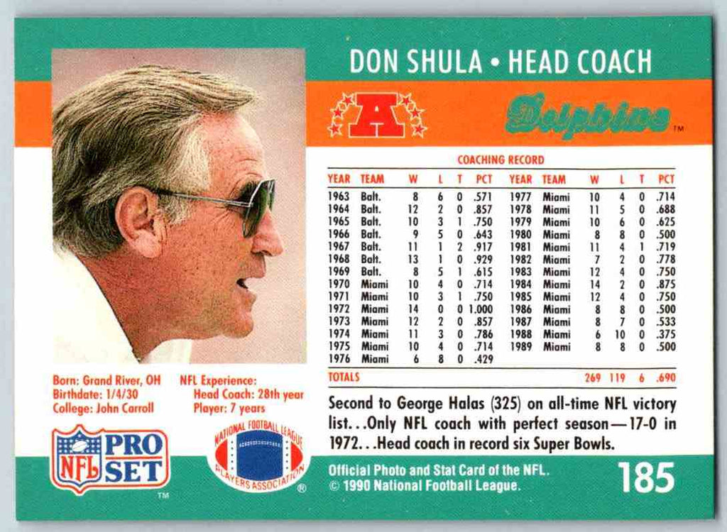 This 1990 Pro Set Don Shula #185 card features the legendary NFL head coach in his signature style. This card captures Don Shula in all his glory, wearing his signature Dolphins coaching hat and a crisp white shirt. This card is the perfect addition to any collection, and a great way to honor a football legend. Don Shula led the Miami Dolphins to two Super Bowl victories and is the NFL’s all-time winningest coach. Add this card to your collection and commemorate the greatness of Don Shula.