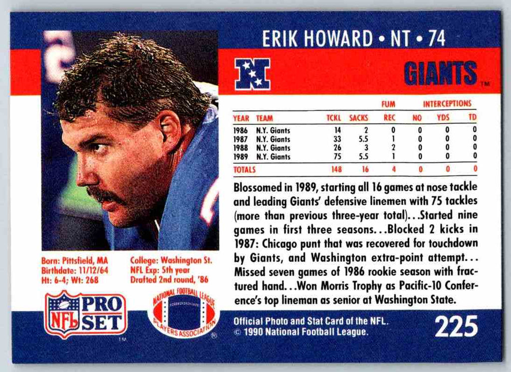 This 1990 Pro Set Erik Howard #225 card from the New York Giants is an essential addition to any serious fan's collection. With crisp, vivid color, this card shows off Howard's legendary intensity and power. Featuring top-notch photography of Howard in action, this card is sure to bring back memories of the Giants' successes. Show off your loyalty and add this card to your collection today!