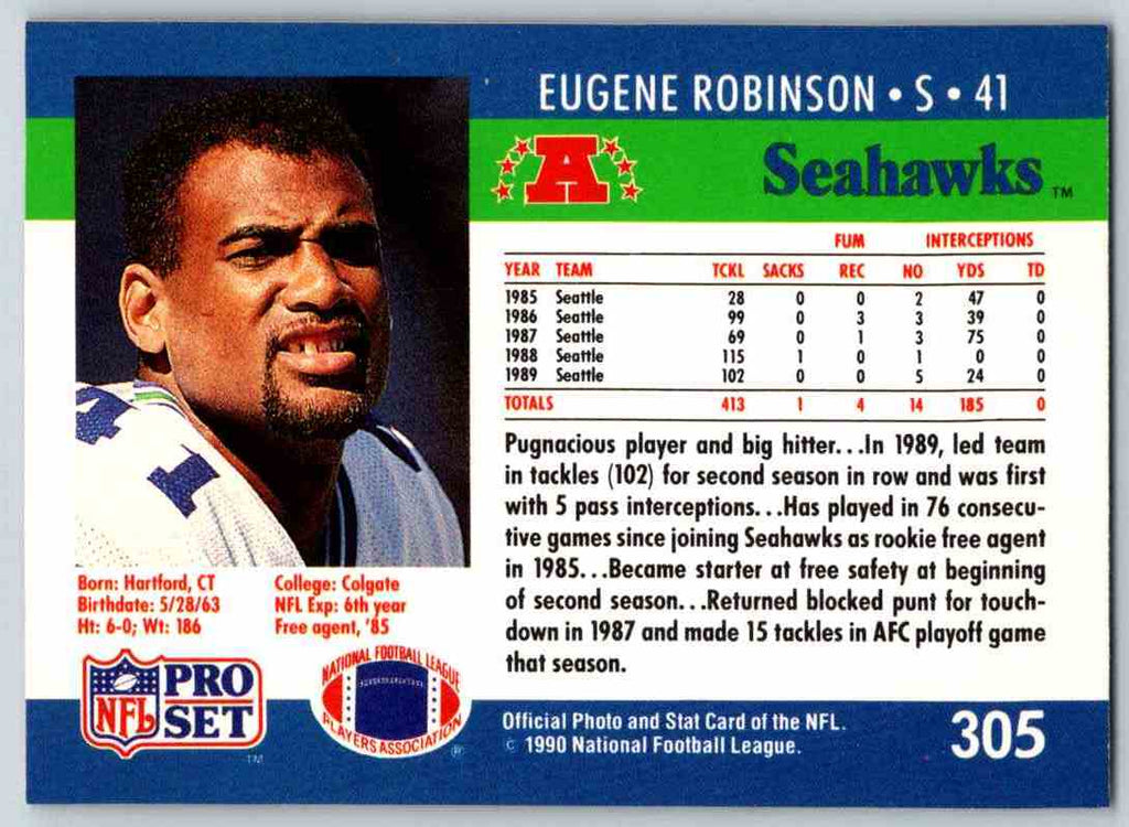 The 1990 Pro Set Eugene Robinson #305 Seattle Seahawks is an essential item for any collector or fan. This card features a full-color action shot of the legendary defensive back, who was a standout for the Seahawks for nine seasons. The back of the card includes his stats and a brief biography. The card is in near mint condition, with crisp corners and no visible wear. Add this card to your collection today and own a piece of Seattle Seahawks history!