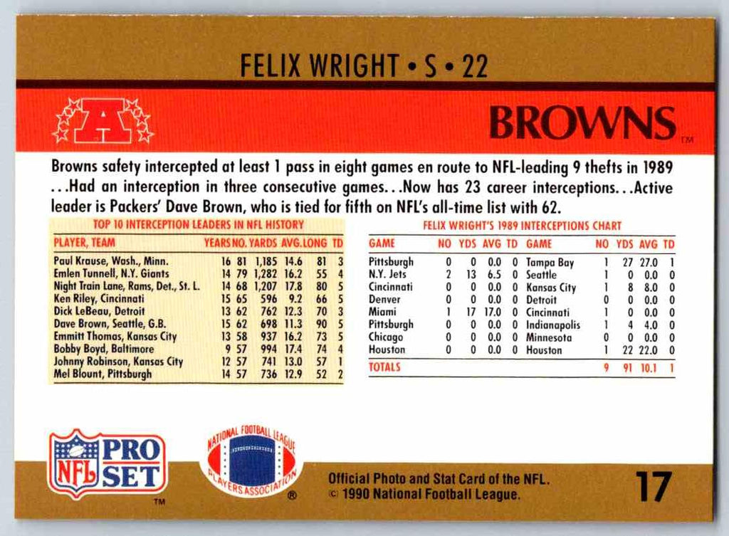 This 1990 Pro Set Felix Wright #17 card is an essential piece for any football fan's collection. Featuring a full-color action photo of the veteran cornerback, this card captures the intense spirit of the game. The back of the card is printed with Felix Wright's career statistics and accomplishments. You don't want to miss out on this classic card!
