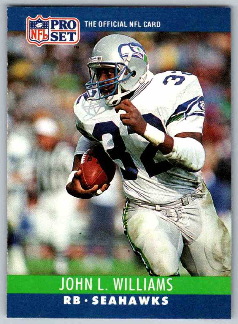 This 1990 Pro Set John L. Williams #306 Seattle Seahawks card features a great action shot of the superstar running back, capturing him in mid-stride. The card is in excellent condition, with sharp corners and vivid colors. Williams was a four-time Pro Bowl selection and a key part of the Seahawks' success in the late 1980s and early 1990s. This card is a must-have for any serious collector of Seahawks memorabilia, or anyone looking to add a great card to their collection.