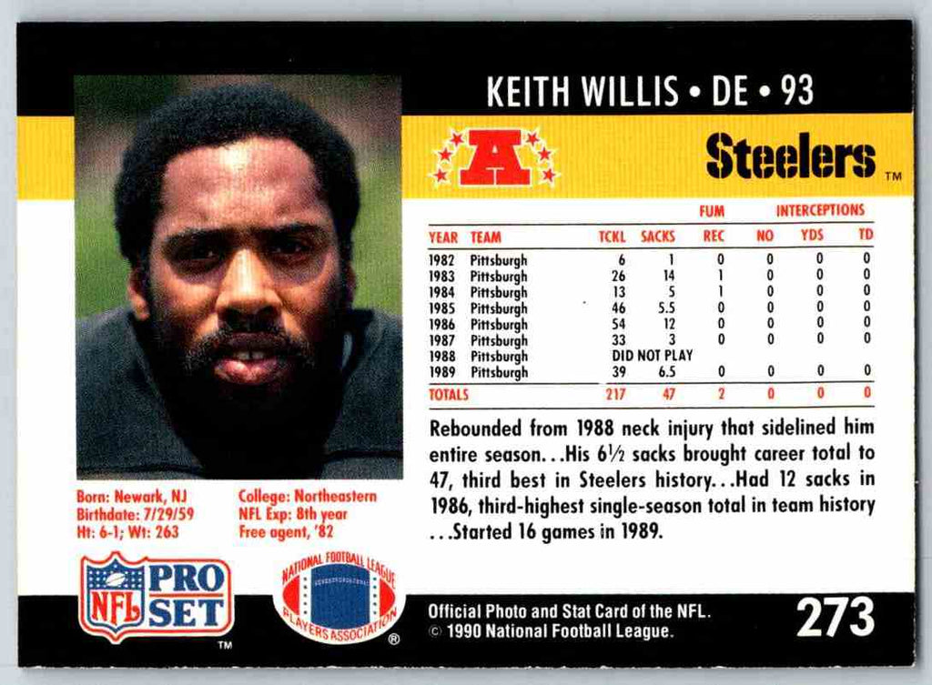 This 1990 Pro Set Keith Willis #273 card is a must-have for any serious Pittsburgh Steelers fan! Featuring a detailed photo of the defensive back in action, this card is a great way to commemorate the 1990 season and Keith Willis' impressive career. It's an excellent addition to any sports memorabilia collection and a great way to show support for your favorite team. Add this card to your collection today!