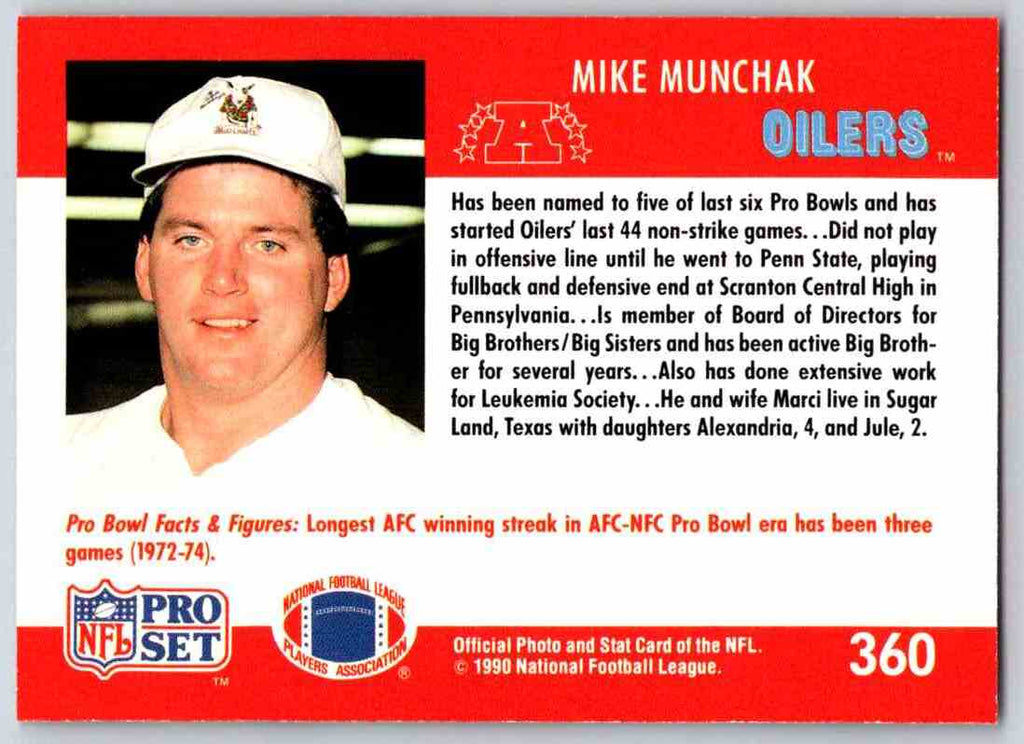 This 1990 Pro Set Mike Munchak #360 Houston Oilers card features a vibrant full-color portrait of the Hall of Fame guard. The card commemorates Munchak's successful 10-year career with the Oilers, during which he was named to nine Pro Bowls and six All-Pro teams. This card is a must-have for any die-hard Oilers fan or Pro Set collector. Add it to your collection today and relive the glory days of the Houston Oilers!