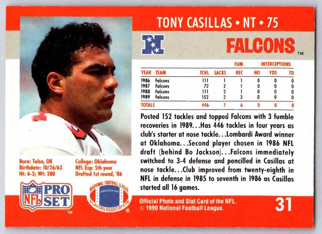 This 1990 Pro Set Tony Casillas #31 card features the two-time Super Bowl Champion, who was an outstanding defensive tackle for the Dallas Cowboys and Atlanta Falcons. This card is in pristine condition and is sure to make any collection shine. Casillas was an All-American at Oklahoma and was the second overall pick in the 1986 NFL Draft. He recorded an impressive 58 career sacks and was a three-time Pro Bowl selection. He was also part of the Cowboys' famed "Doomsday Defense" and was a key piece of the 1995 Falcons' Super Bowl run. This card is a must-have for any NFL fan and card collector.