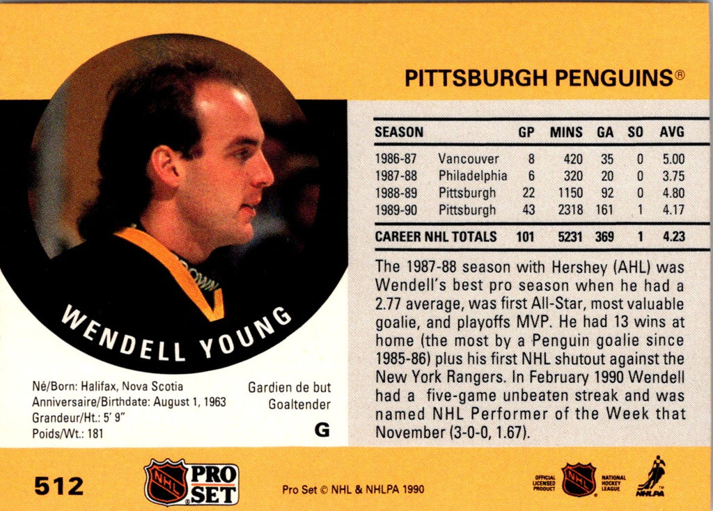 The 1990 Pro Set Wendell Young #512 Pittsburgh Penguins card is a must-have for any hockey collector. Featuring Wendell Young in a classic Penguins jersey, this card is a great addition to any collection. The card is printed on glossy card stock with vivid colors that bring the image to life. On the back of the card, you can read a brief bio of Wendell Young and a list of his career accomplishments. Add this classic card to your collection and show your Pittsburgh Penguins pride.