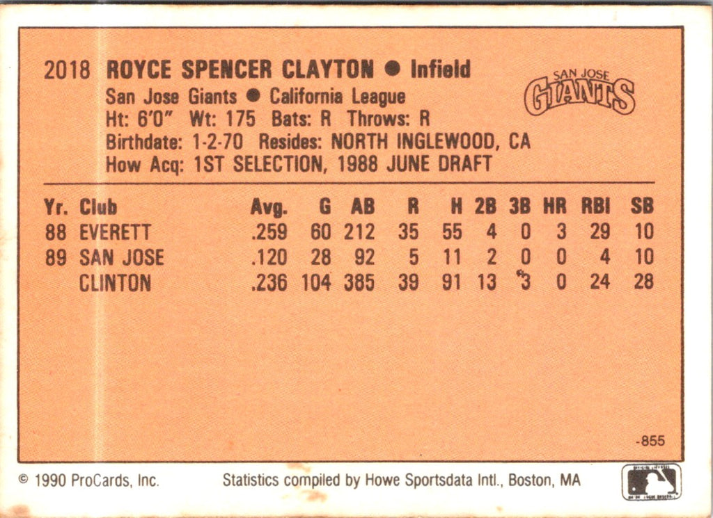 This 1990 ProCards Royce Clayton #2018 San Jose Giants card is a must-have for any baseball fan! Featuring a classic black-and-white photo of the legendary San Francisco Giants shortstop, this card celebrates his career with the Giants and honors the team's history. The back of the card includes detailed stats of his career as well as an interesting biography. Whether you're a serious collector or just a fan of the Giants, you won't want to miss out on this timeless piece of memorabilia!
