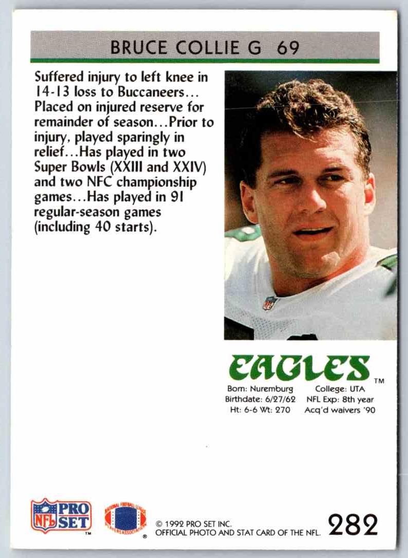This 1990 Proset Bruce Collie #282 is an amazing collectible item for any football lover! Featuring a stunning full-color photo of Collie in action, this card is sure to be a great addition to your sports memorabilia. The back of the card also includes an in-depth bio and detailed stats of Collie's career, making it an ideal display piece or conversation starter. With its pristine condition, this card is a must-have for any football fan or collector.