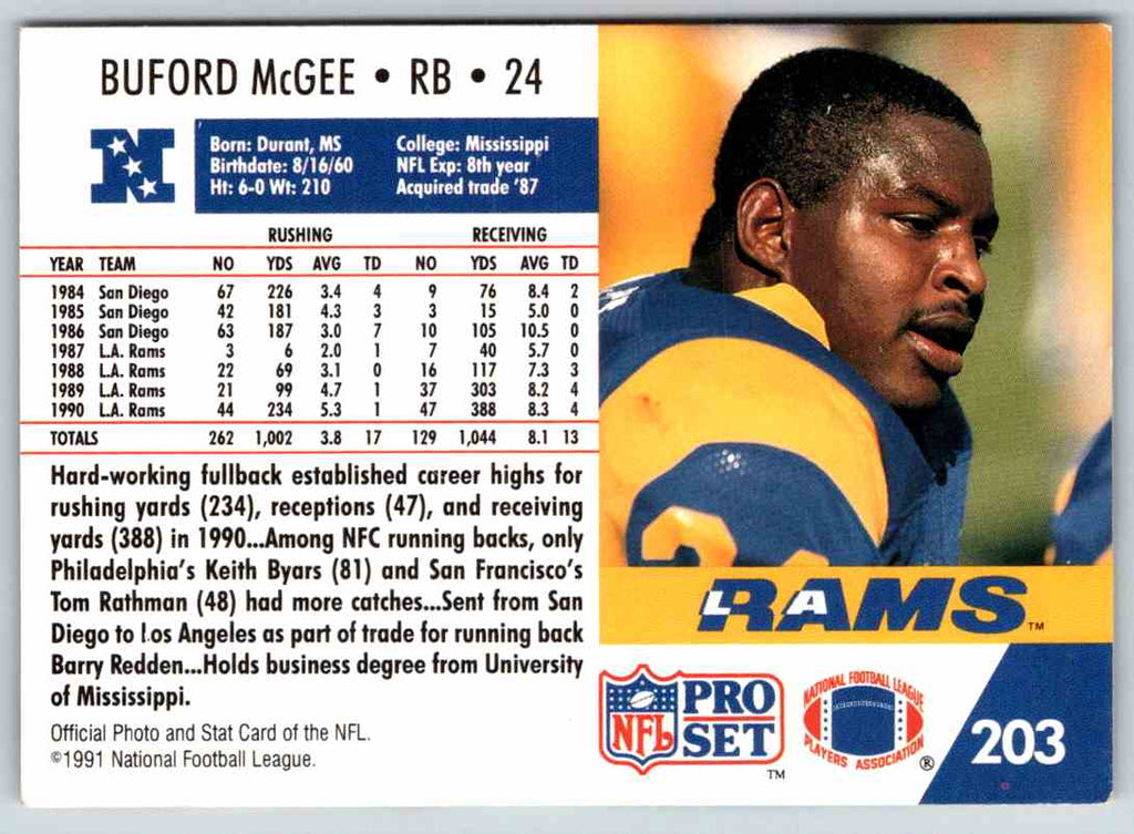 This 1990 Proset Buford McGee #203 card is a must-have for any sports memorabilia collector. Showcasing a classic black-and-white portrait of the legendary running back, this card is perfect for framing and displaying proudly. Printed on glossy card stock, the card is in excellent condition, with no creases or tears. The back of the card includes detailed stats and a unique bio, making it a great addition to any collection. Add this classic card to your collection today!