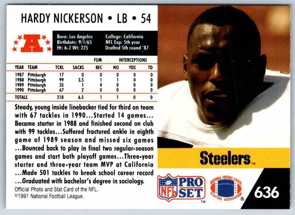 1990 Proset Hardy Nickerson #636 celebrates the Hall of Fame linebacker's first season with the Tampa Bay Buccaneers. This collectible card features a dynamic action shot of Nickerson in the middle of a tackle. His white jersey stands out against the green and orange of the Buccaneers' uniforms. The back of the card contains a brief biography and impressive stats from Nickerson's career. This card is a must-have for any Buccaneers fan or collector of vintage football cards. Add this classic card to your collection today!