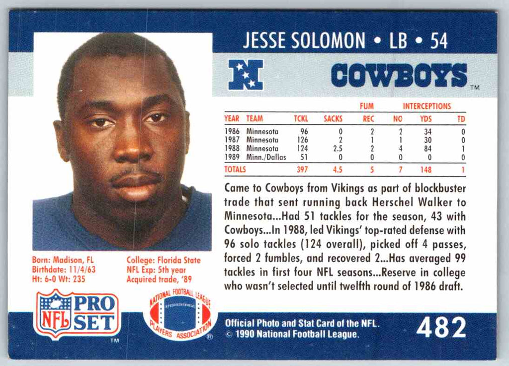 This 1990 Proset Jesse Solomon #482 is a must-have for any collector. Featuring a glossy photo of the Hall of Fame defensive end, this card is sure to make a great addition to any sports memorabilia collection. The card includes a detailed profile and statistics of Solomon's career, making it a perfect way to commemorate his impressive achievements. The card is in mint condition, making it a great addition to any fan's collection. With its classic design and quality construction, this card is sure to stand the test of time. Get your hands on this incredible piece of football history today!
