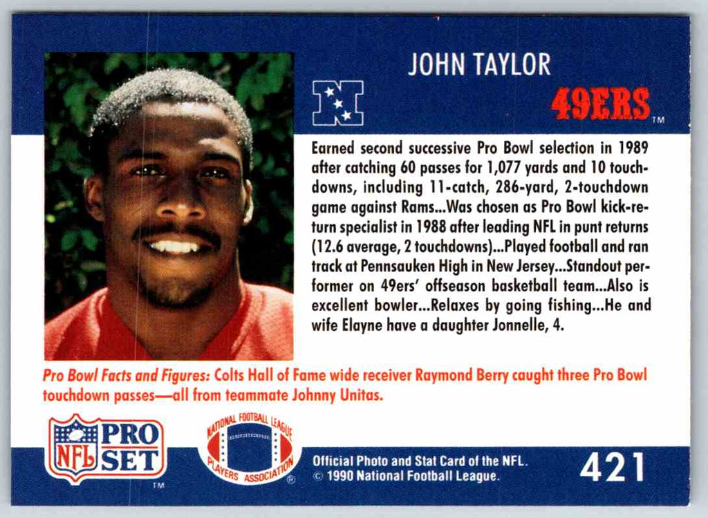 This 1990 ProSet John Taylor #421 card is the perfect addition to any collection. Featuring Taylor in his classic red and white San Francisco 49ers jersey, this card captures the electrifying player in prime form. His intense gaze and powerful stance make this card a must-have for any fan of the NFL. The card is printed on thick, durable stock which is sure to last for years to come. Whether you are a football fan or a collector, this card is sure to please!