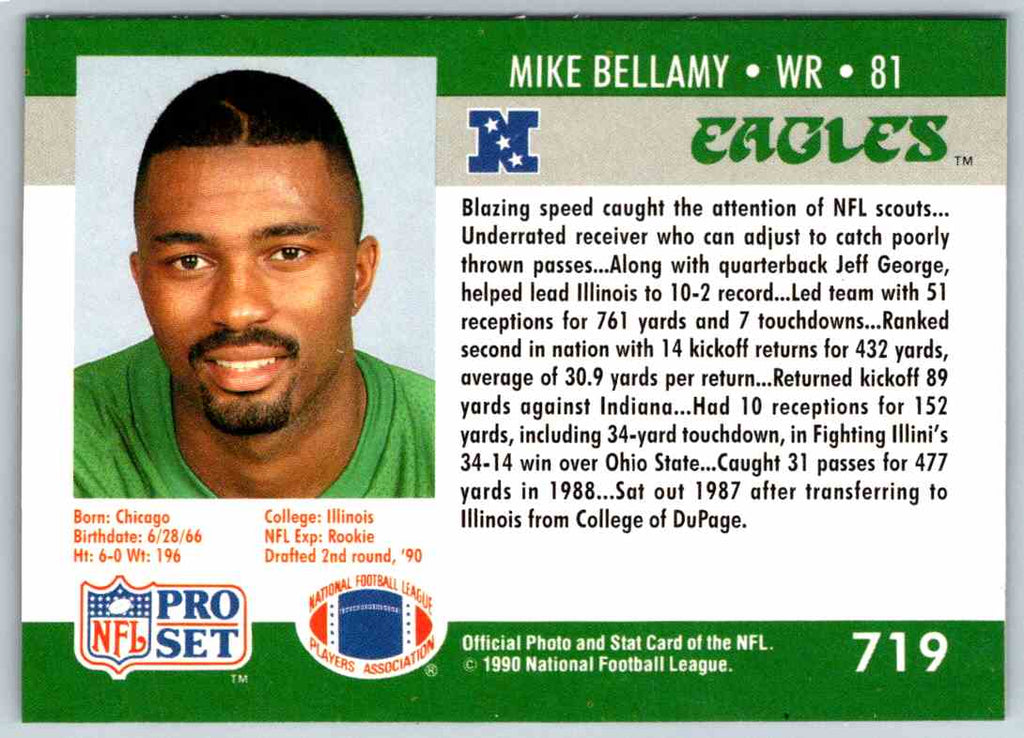 This 1990 Proset Mike Bellamy card #719 is a must-have item for any serious sports collector. Featuring vibrant, full-color photography, this card captures the excitement of the game as Mike Bellamy was a star running back for the Chicago Bears. The card is in near-mint condition and is perfect for any collection. With a unique design and high-quality construction, this card is sure to make a great addition to any collection.