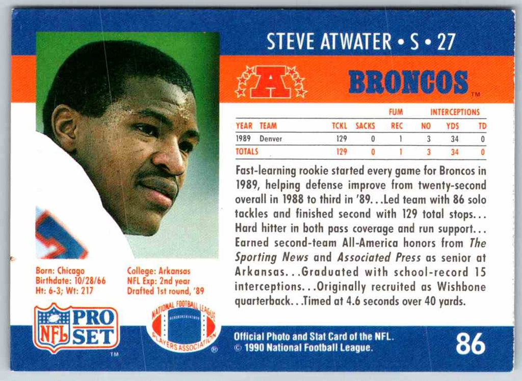 This 1990 Proset Steve Atwater #86 card is a must-have for any NFL collector. Featuring a classic action shot of the Denver Broncos' legendary safety, this card is sure to be a conversation starter in any collection. It comes in excellent condition, with an ultra-glossy finish that ensures it will remain in pristine condition for years to come. With its striking colors and graphics, it's the perfect way to show your appreciation for the Hall of Famer's impact on the game. Add this card to your collection today and show your support of the all-time great!