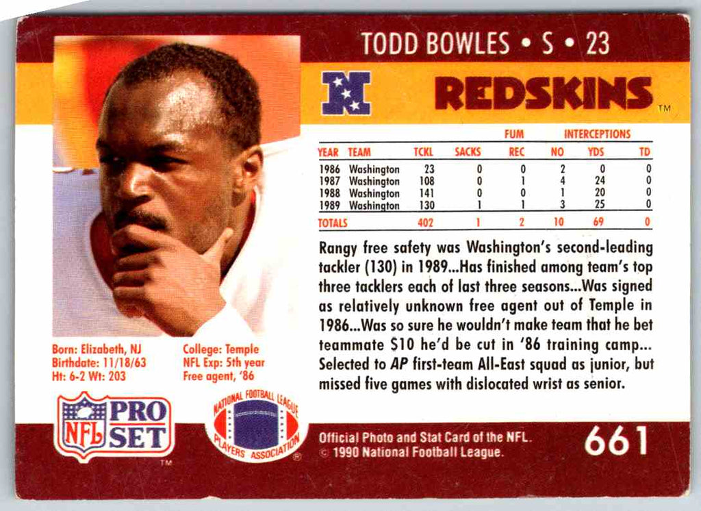 This 1990 Proset Todd Bowles #661 card is a must-have for any serious sports memorabilia collector! It features an iconic image of the professional football player, and is printed on premium card stock. The card features detailed graphics, vivid colors, and a glossy finish, all of which help to preserve the card's condition over time. This card also includes valuable stats and career highlights, making it a great conversation piece for any sports fan. Add this card to your collection today and show off your love for the game!