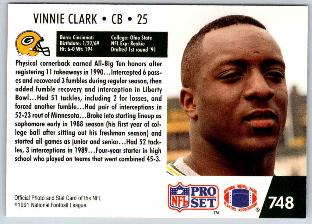 The 1990 Proset Vinnie Clark #748 is the perfect card for any collector. With a glossy finish, this card features a dynamic action shot of Vinnie Clark, one of the most iconic figures in NFL history. His on-field accomplishments are sure to make any collector proud to have this card in their collection. Celebrate the legacy of one of football's legendary figures with the 1990 Proset Vinnie Clark #748. Add it to your collection today!